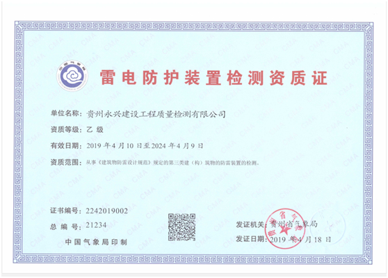 公司于2019年4月18日成功通过雷电防护装置资质等级评定,取得了雷电防护装置检测资质