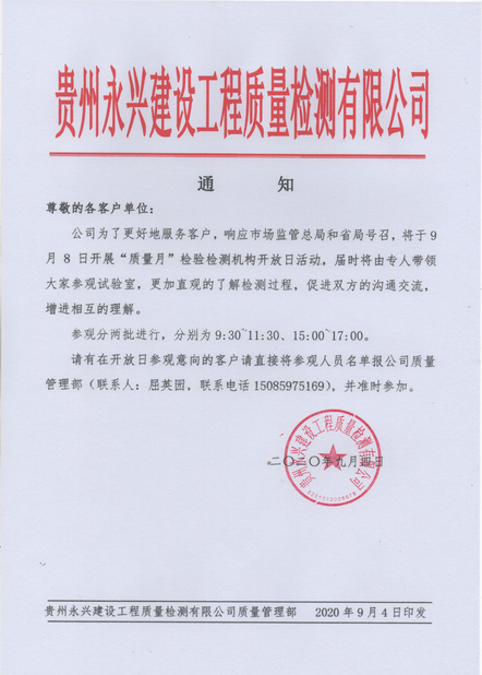 公司为了更好地服务客户,响应市场监管总局和省局号召,将于9月8日开展“质量月”检验检测机构开放日活动,届时将由专人带领大家参观试验室,更加直观的了解检测过程,促进双方的沟通交流,增进相互的理解。