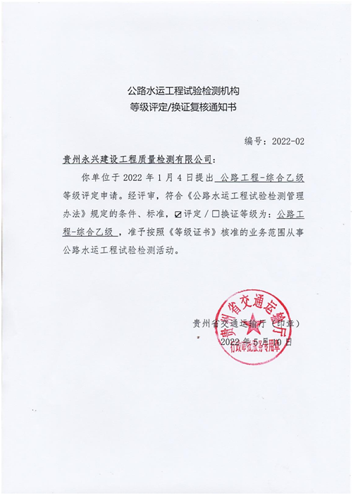 经过近半年的努力,公司于2022年5月10日取得了公路工程试验检测综合乙级资质