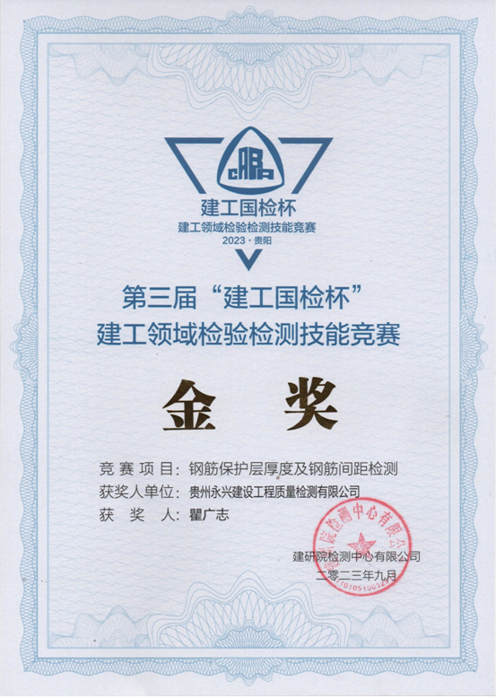 2023年9月14日,由建研院检测中心有限公司和中国土木工程学会工程质量分会联合主办的第三届“建工国检杯”2023年度建工领域检验检测技能竞赛在贵州贵阳举行,本次竞赛项目分别为“结构实体钢筋保护层厚度及间距检测”、“结构实体裂缝深度检测”和“建筑钢结构焊缝超声波检测”三项。经过激烈紧张的角逐,公司轨道交通部瞿广志、结构工程部闫杰不负众望,在全部选手中脱颖而出,分别荣获 “金奖(钢保)”和“优秀奖(焊缝无损)”;结构工程部周文文、胡宗汗也圆满完成了比赛,获得“成绩合格”证书。